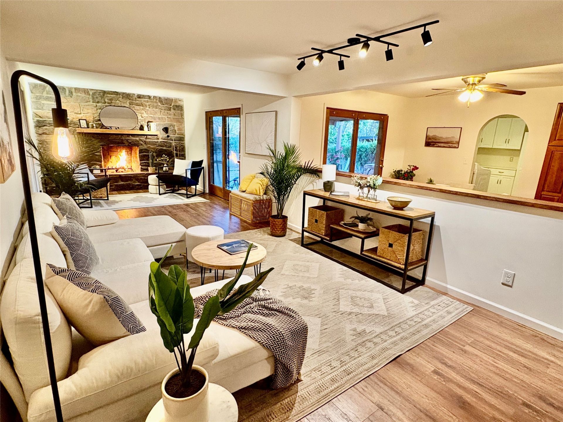 Good size living room with rock fireplace. Recent updates include kitchen; new bathrooms and laundry; handsome Hickory Mill laminate floors; tile floors in kitchen and baths; new furnace, water heater, & plumbing. Pella windows throughout. Skylights. 2019 torch-down roof. 1592 sq. ft. plus attached 1 car garage. Fenced backyard ready for landscaping looks to open acreage. No HOA.